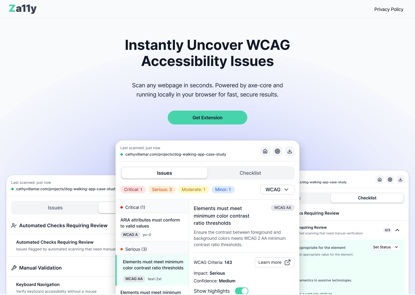 Za11y (pronounced “Zall-eye”) is a fast, lightweight Chrome extension for checking accessibility directly in the browser. It works on any website or app, stores no user data, and delivers clear, easy-to-digest results in seconds—without the complexity of traditional accessibility tools.
